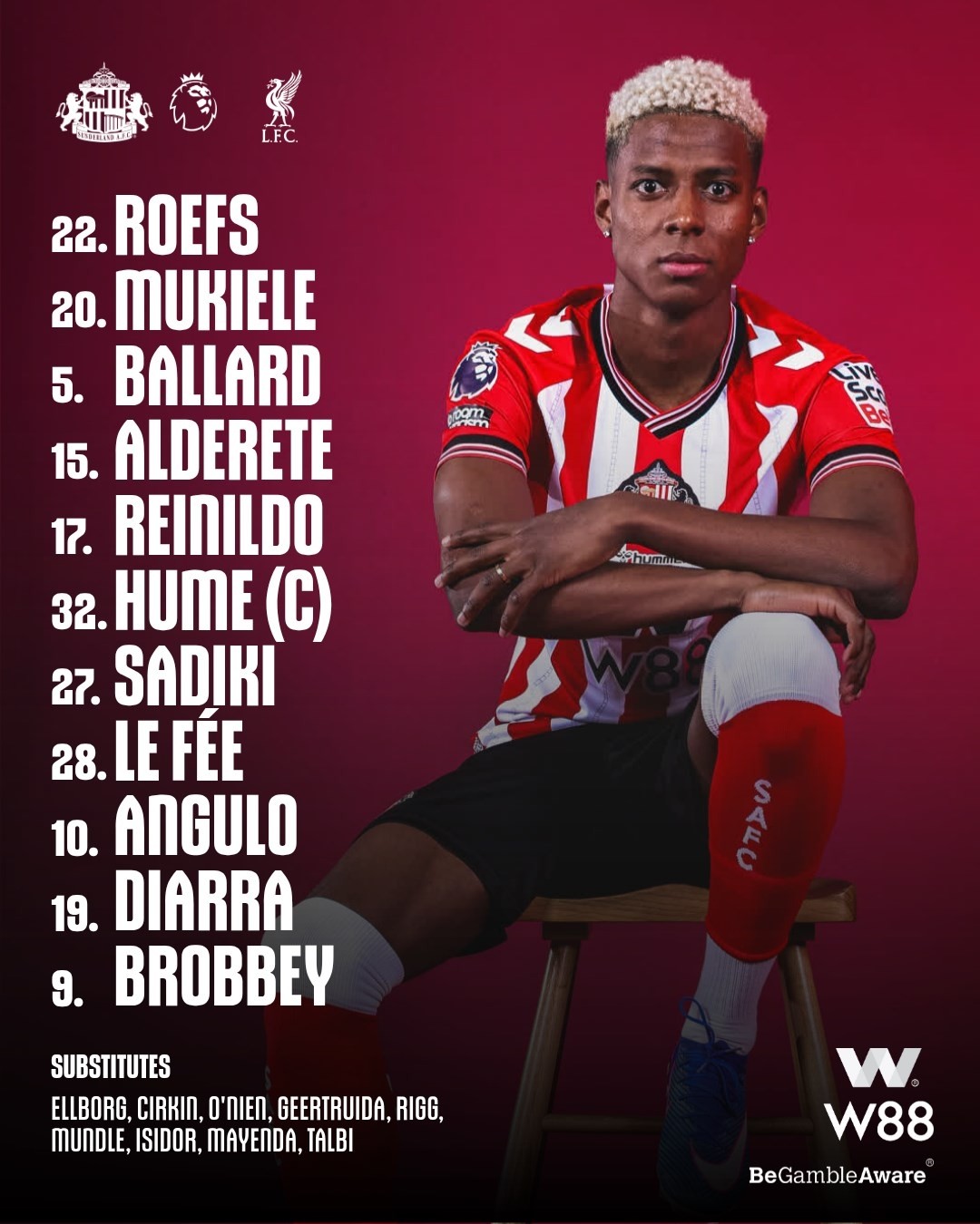 桑德兰首发:22-罗埃夫斯、20-穆杰莱、5-巴拉德、15-阿尔德雷特、17-雷尼尔多、32-休姆、27-萨迪基、28-勒费埃、10-尼尔松-安古洛、19-哈比卜-迪亚拉、9-布罗贝伊