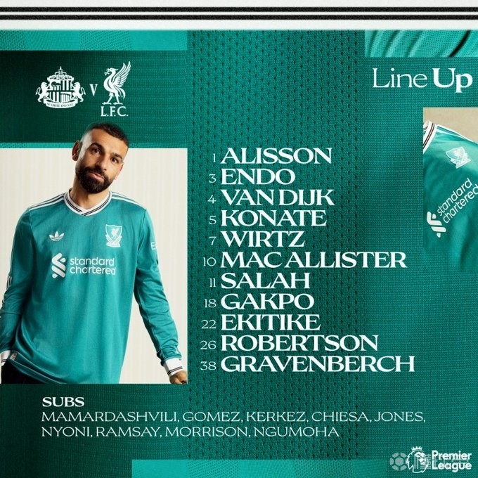 利物浦首发:1-阿利松、3-远藤航、4-范戴克、5-科纳特、26-罗伯逊、38-赫拉芬贝赫、10-麦卡利斯特、7-维尔茨、11-萨拉赫、18-加克波、22-埃基蒂克