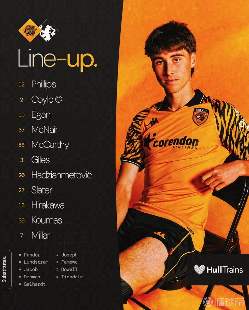 赫尔城首发:12-菲利普斯、37-麦克奈尔、15-伊根、58-麦卡锡、2-科伊尔、27-斯莱特、20-哈吉艾哈迈托维奇、3-贾尔斯、7-米勒、13-平河悠、36-库马斯