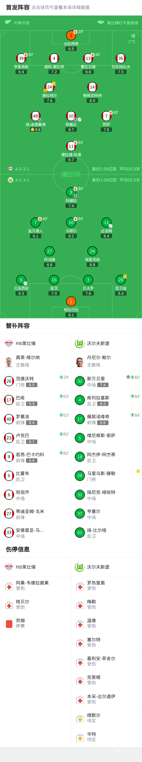 第70分钟,格拉巴拉开球失误,格鲁达助攻迪奥曼德破门,莱比锡1-1沃尔夫斯堡