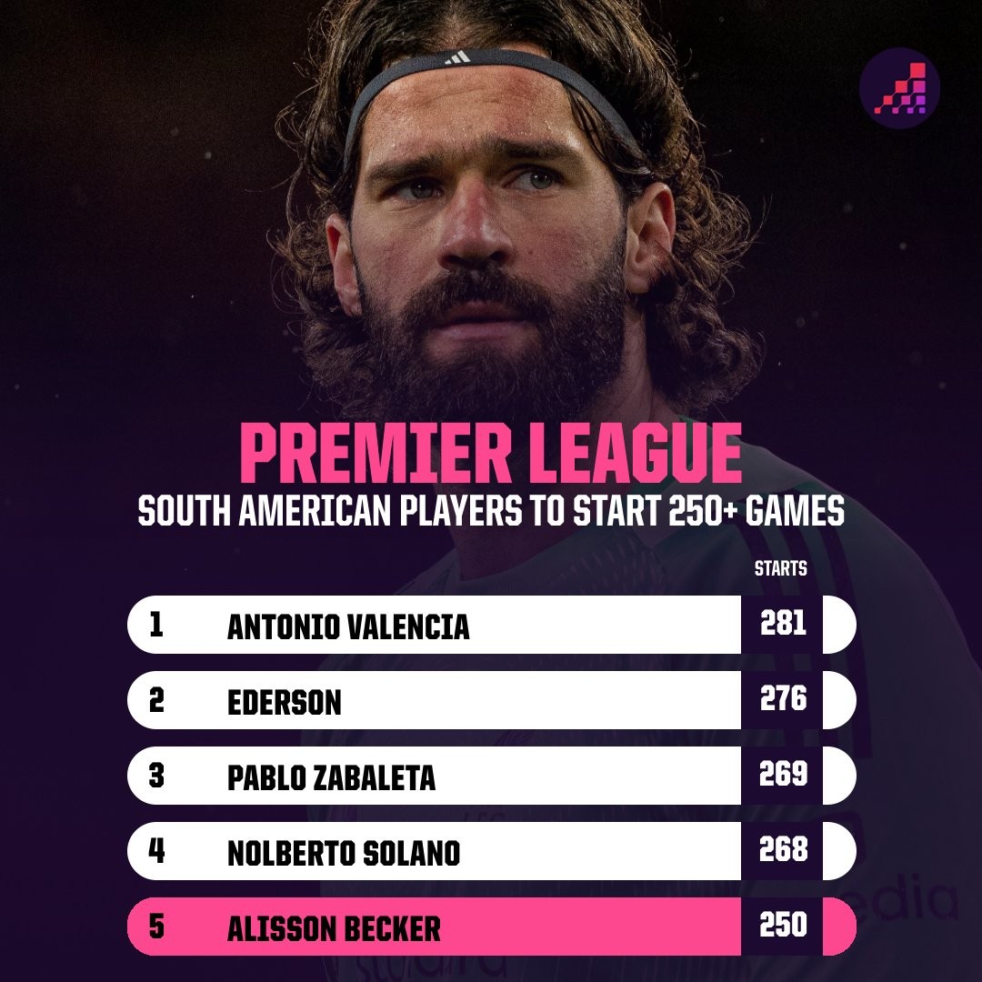 达成英超250场里程碑,阿利松成南美球员第五人